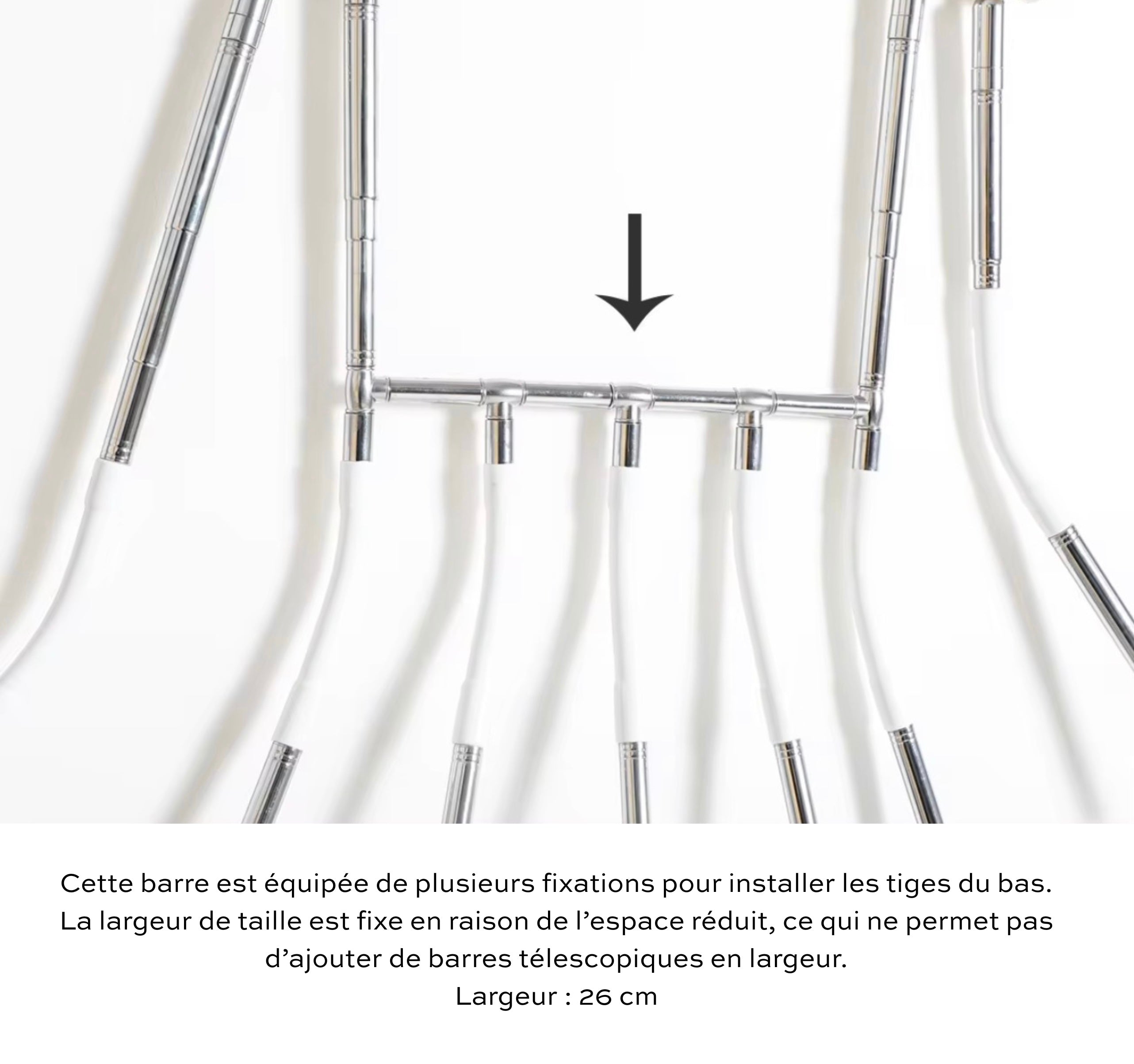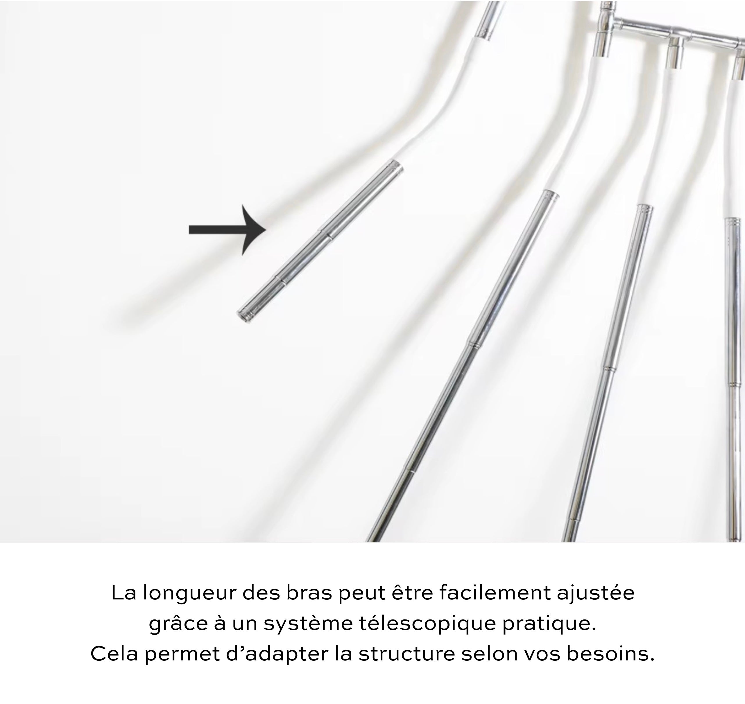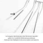 5 pôles articulés pour régler la largeur du produit, également réglable en longueur. Peut s'utiliser pour les enfants lorsque c'est au plus court.