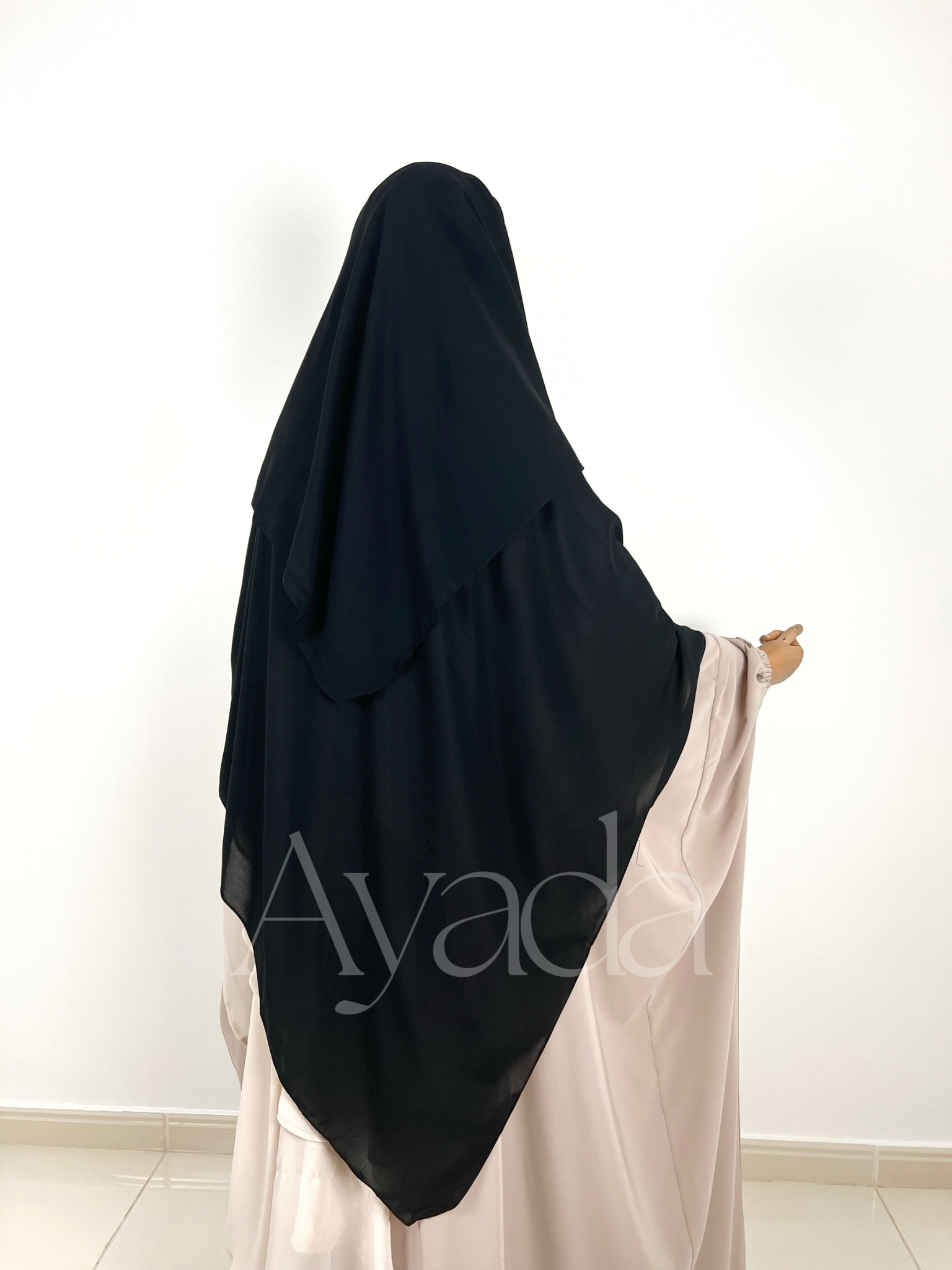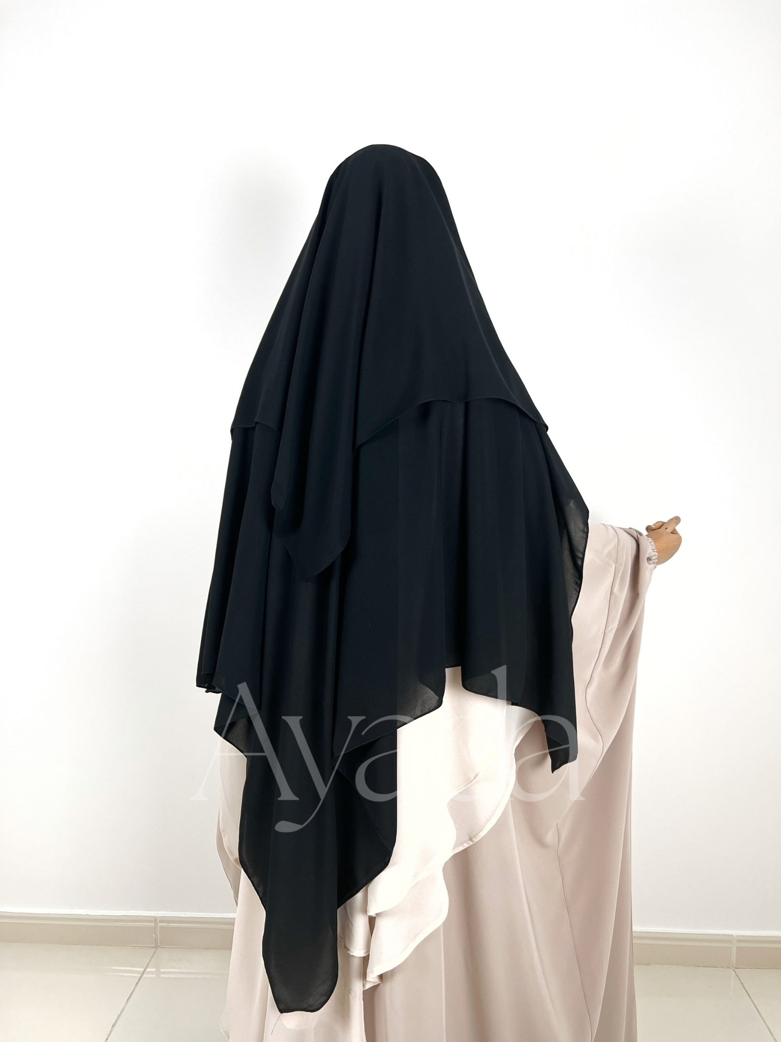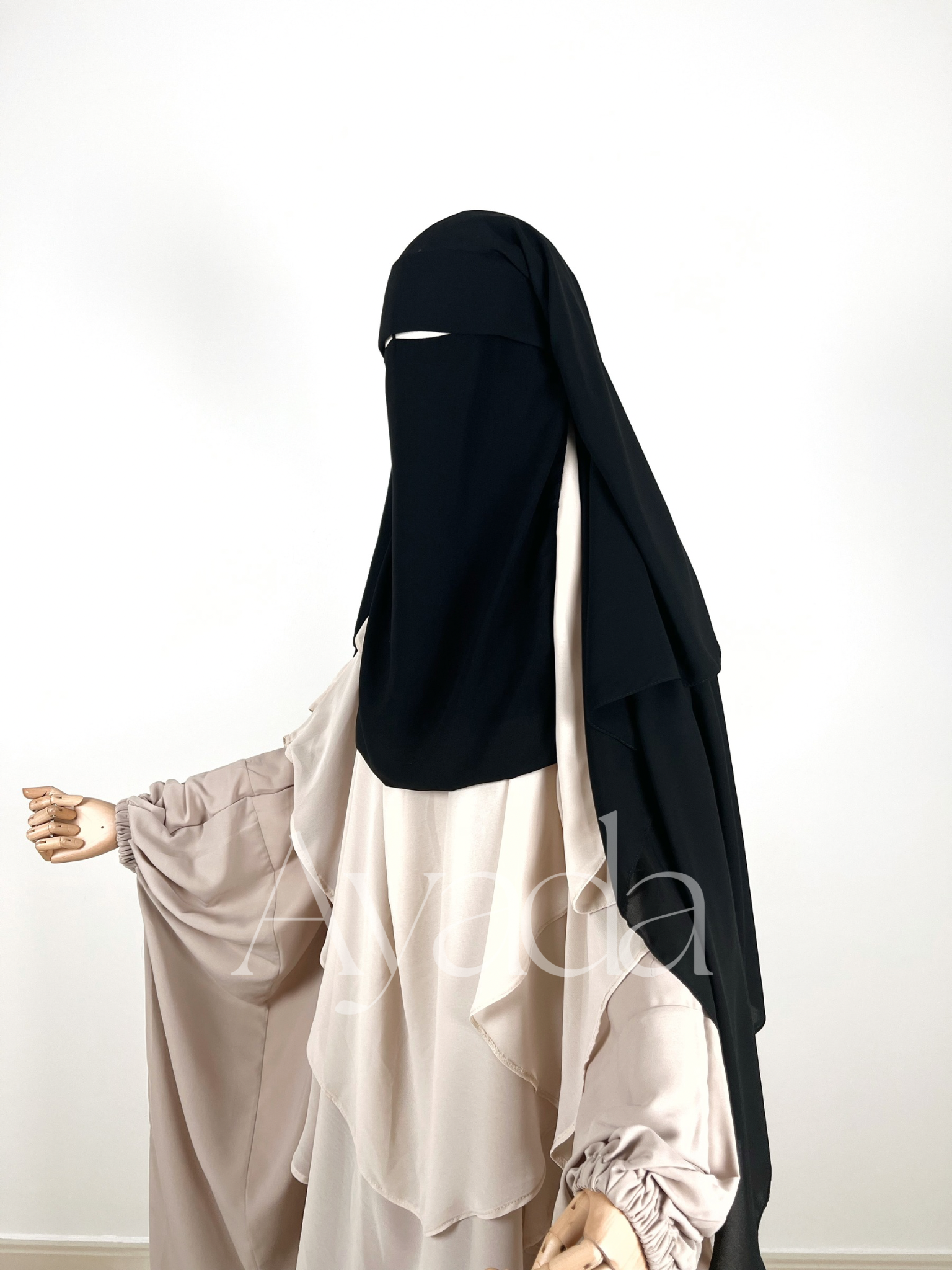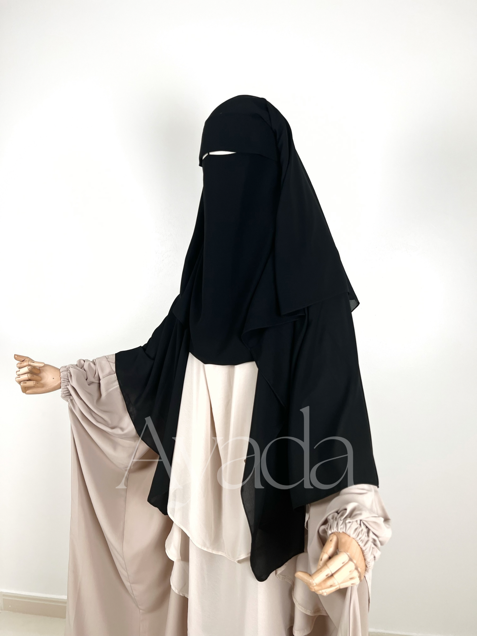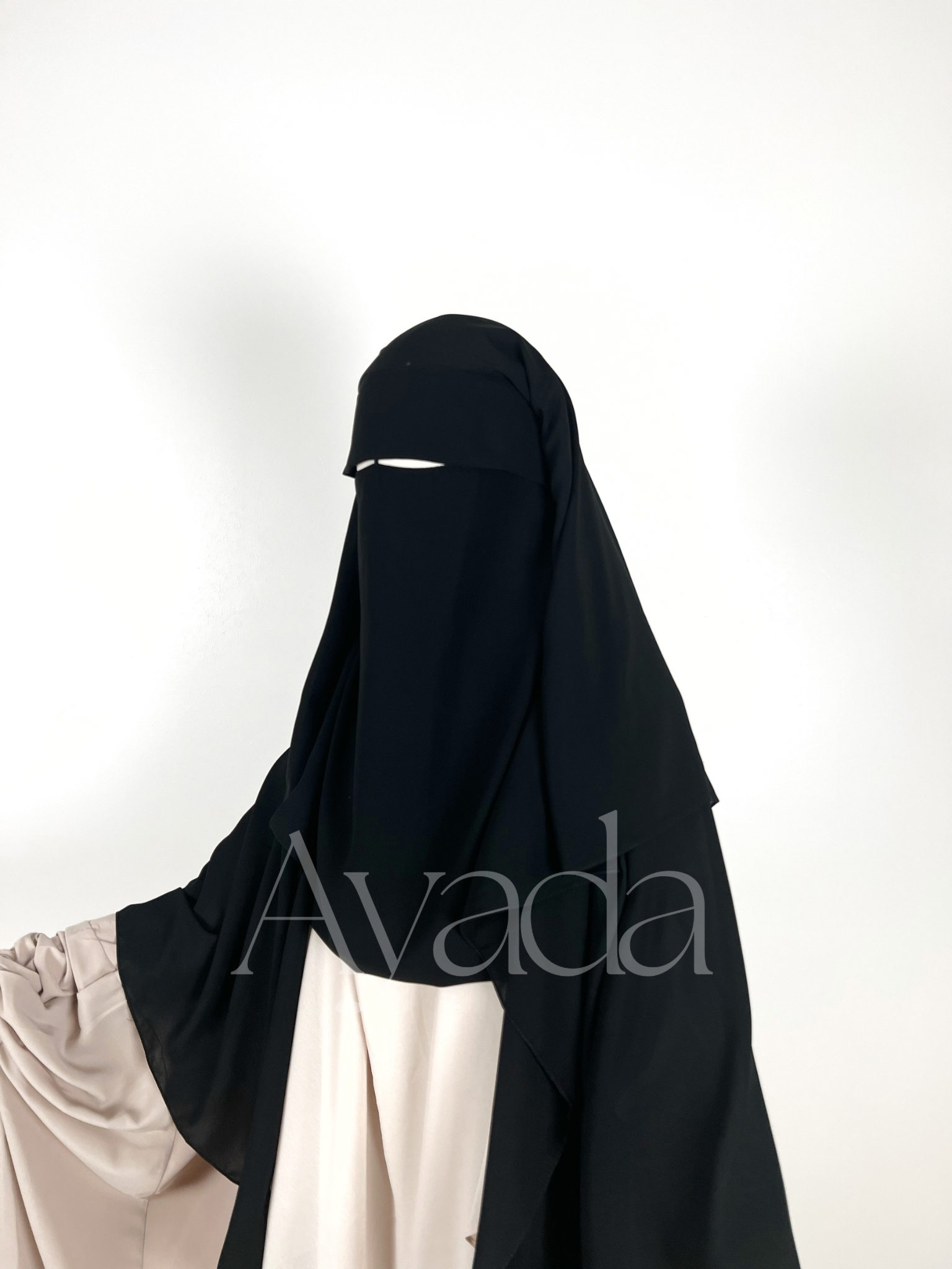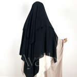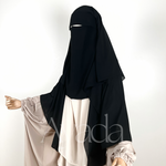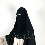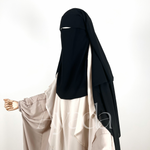 Dieser Niqab/Sitar ist aus ägyptischem Musselin gefertigt, sodass Sie frei atmen können. Er besteht aus drei Schleiern, einem rechts, einem in der Mitte und einem links für mehr Schutz. Die gefaltete Sitar bedeckt Sie außerdem vorne stärker.